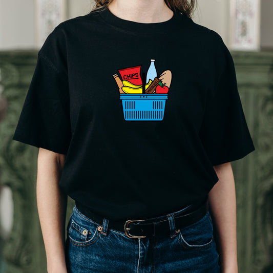 Shopping basket filled with delicious food and drinks
