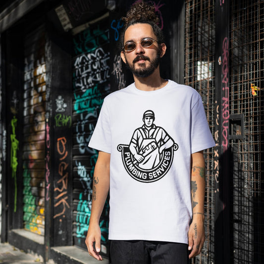 Creative plumbing service logo design featuring a technician