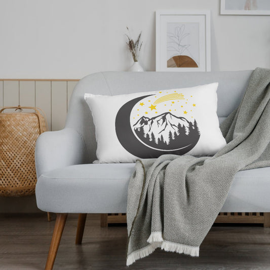 Moonlit mountain landscape with stars and comet design