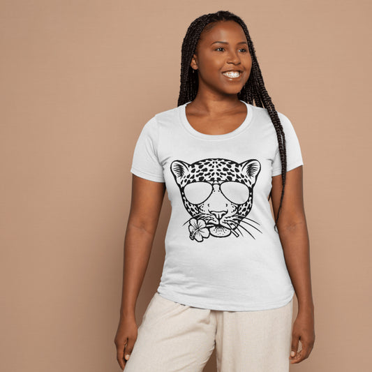 Stylish jaguar wearing sunglasses with a tropical flower