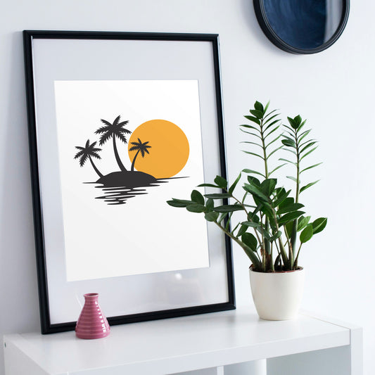 Vibrant palm tree silhouette against a warm sunset backdrop