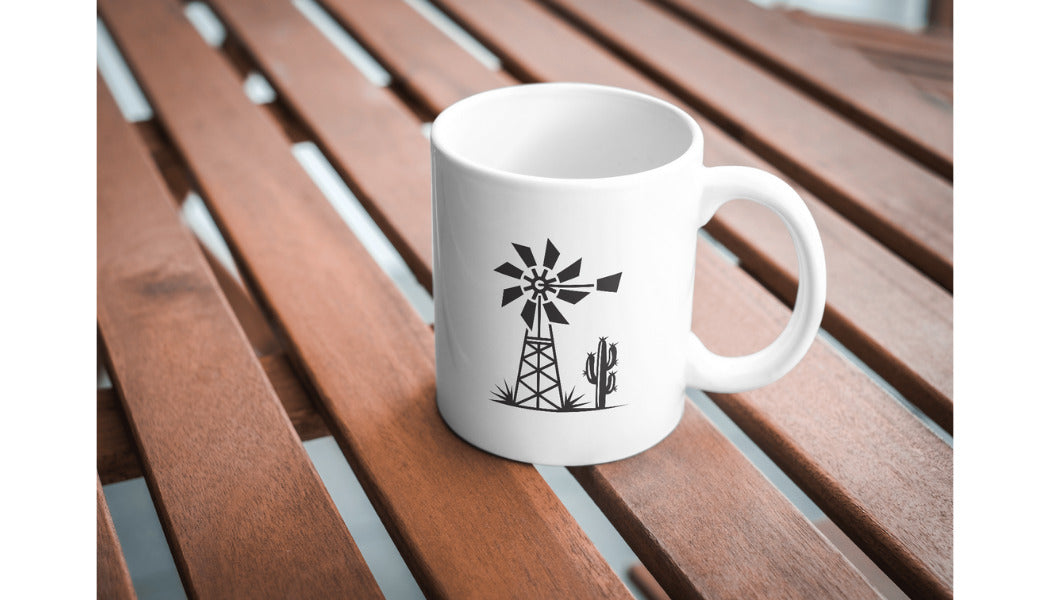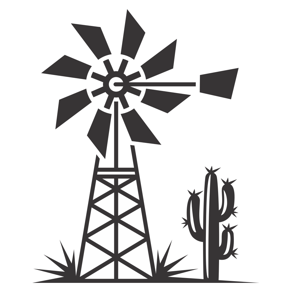A detailed vector illustration features a windmill standing tall next to a cactus in a barren landscape, perfect for creative cutting machine projects and artistic designs.