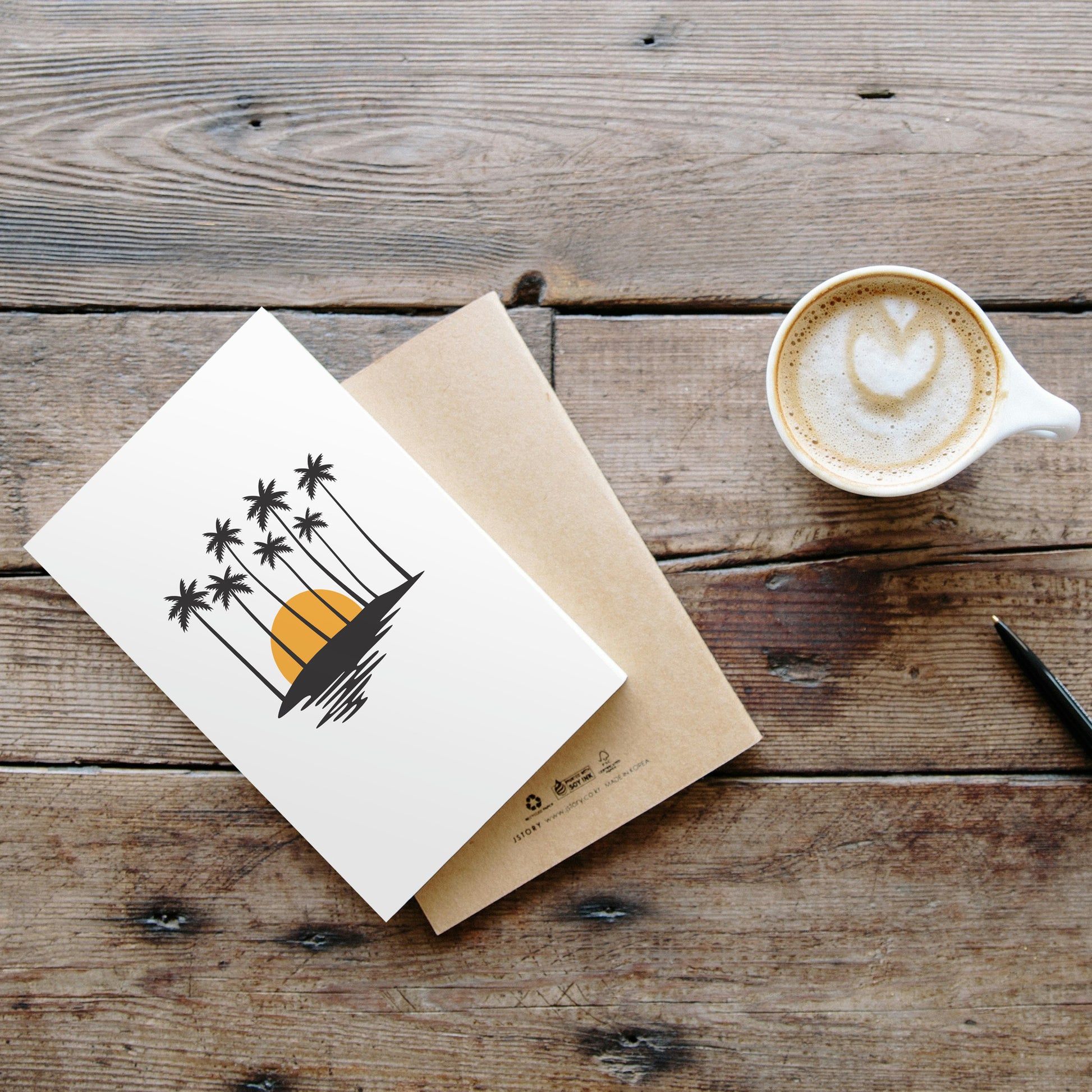 A tranquil sunset casts a warm glow behind tall palm trees, reflecting on the calm water below. This design captures the essence of a peaceful tropical paradise at dusk.