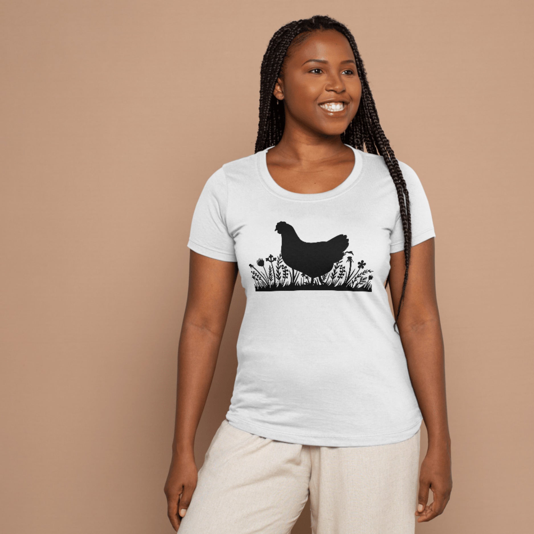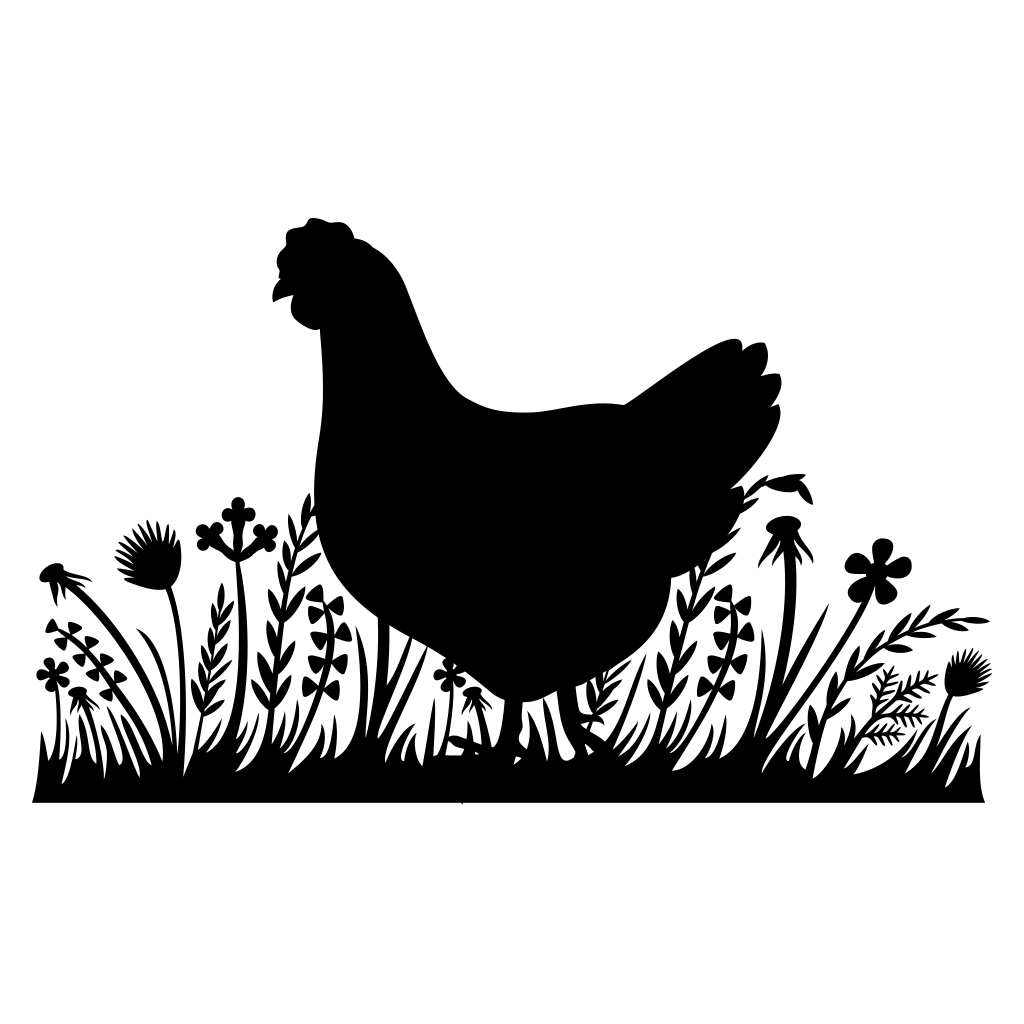 A delightful chicken stands gracefully among vibrant grasses and wildflowers, capturing a serene moment in nature. Perfect for creative projects needing a strong farm theme.