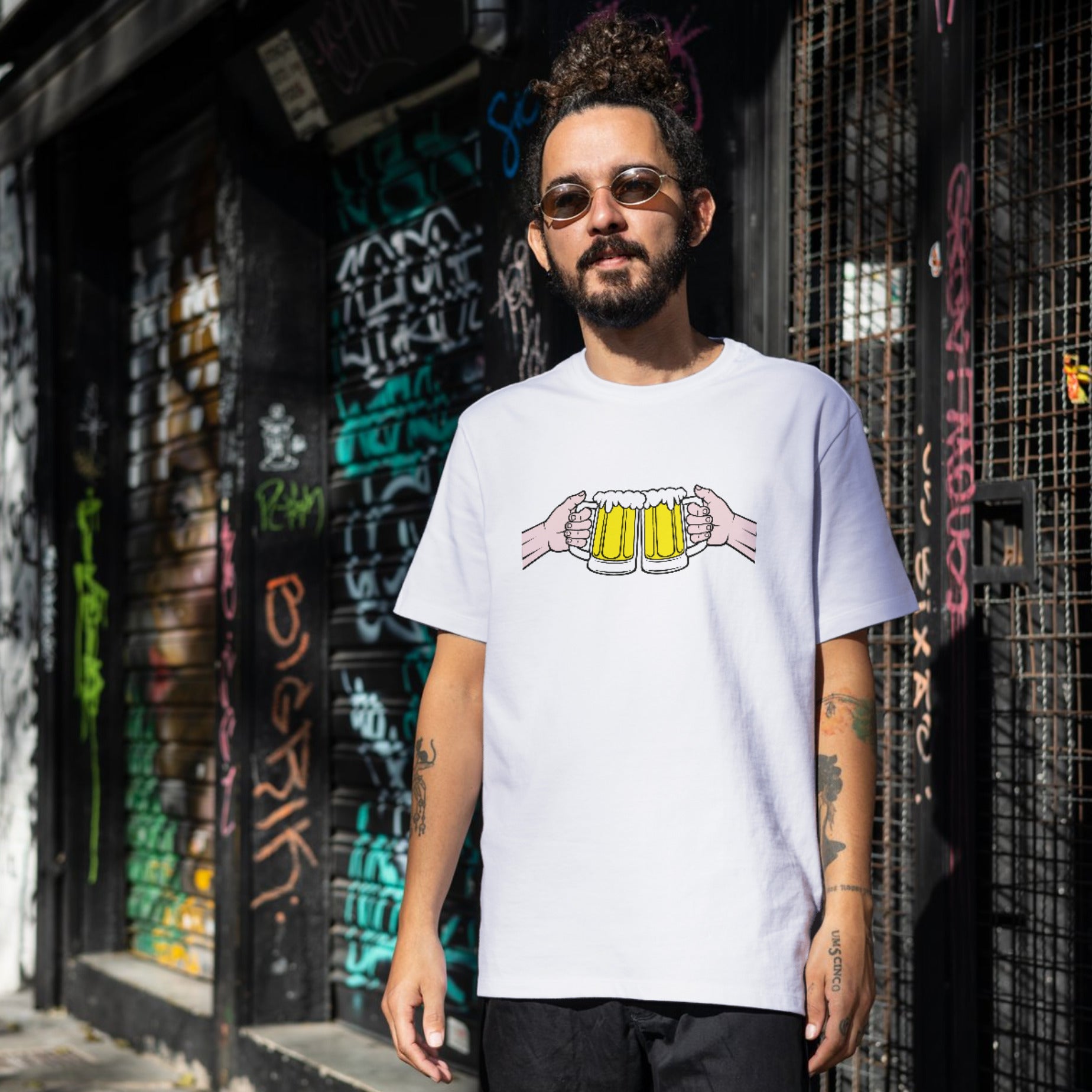 Two hands raise glasses of golden beer in a toast, capturing the essence of camaraderie and celebration. This artistic representation is perfect for festive occasions.