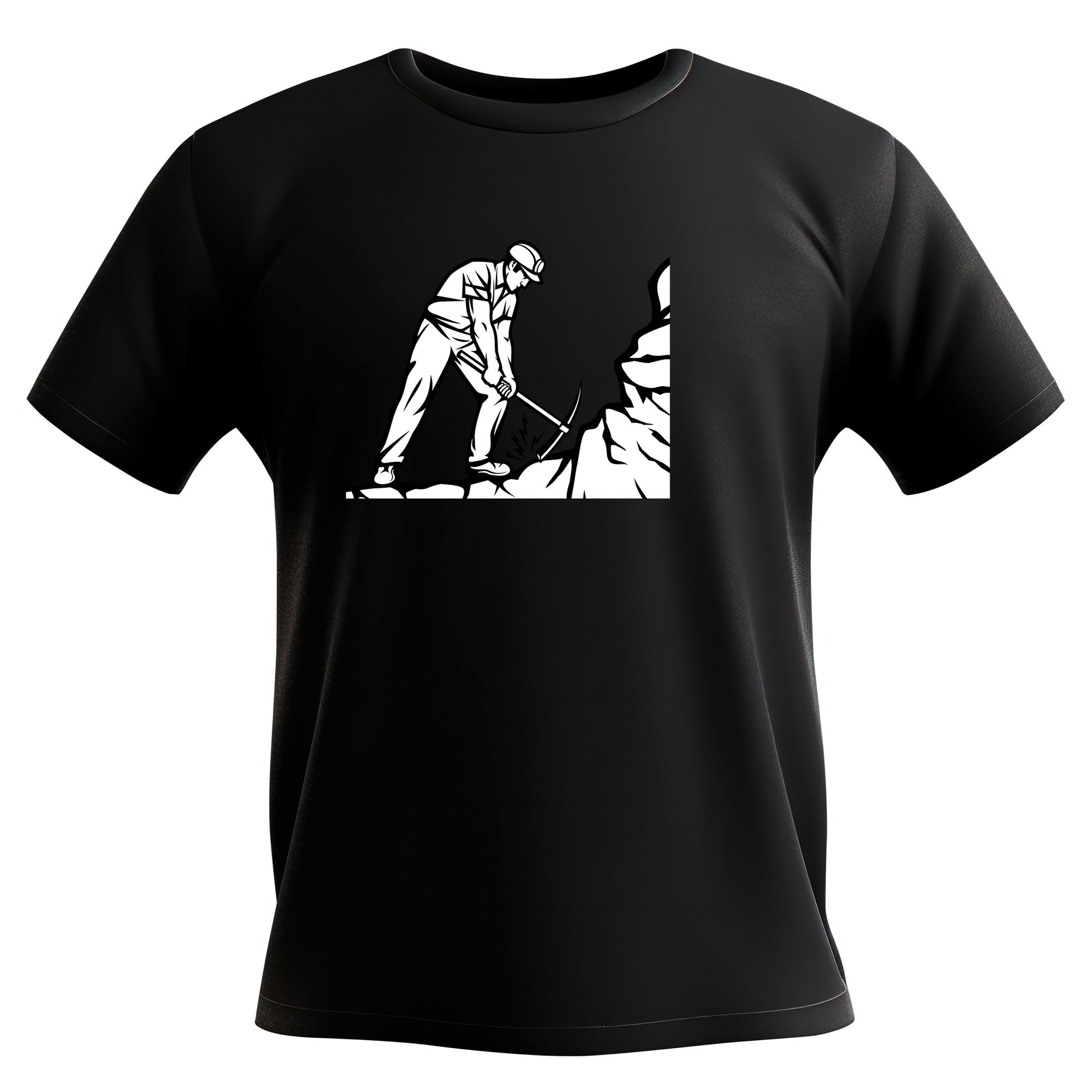 A skilled coal miner stands firmly on rocky ground, using a pick ax to break apart hard minerals. His stance reflects determination and confidence in his labor and environment.