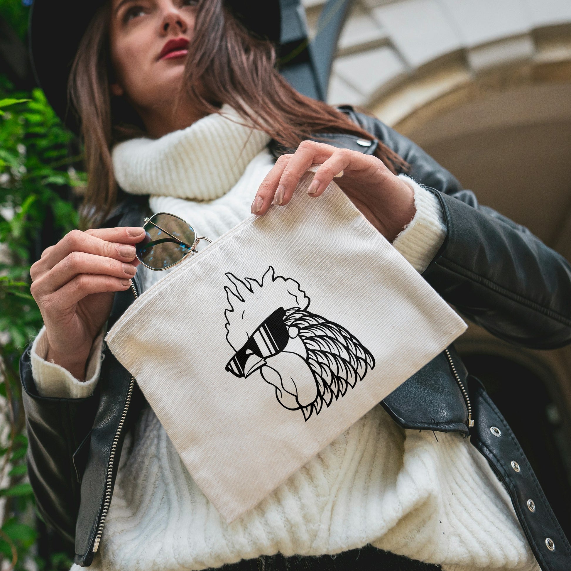 This vector SVG showcases a stylish black and white rooster wearing sunglasses, perfect for unique crafting projects or stylish home decor designs.