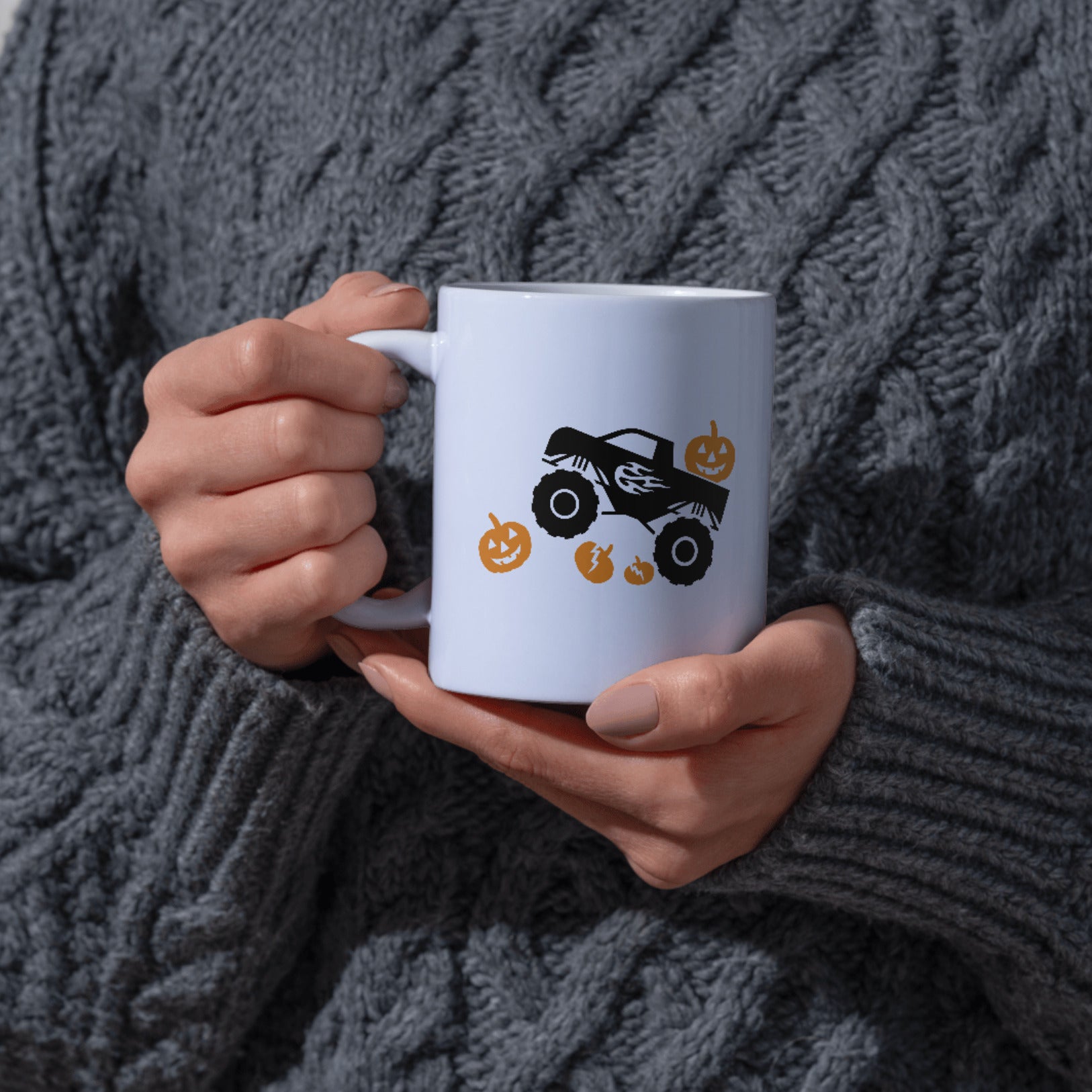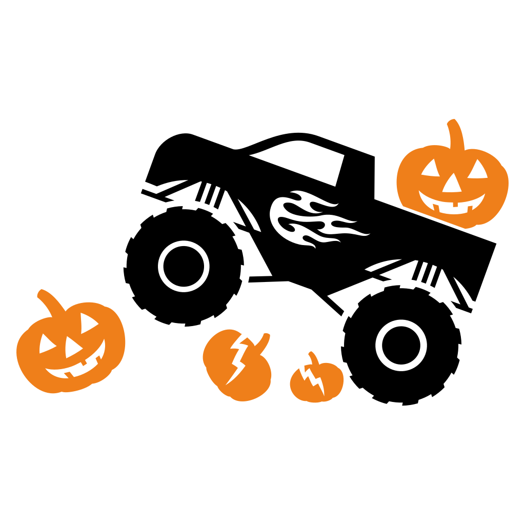 This vibrant design showcases a playful pumpkin monster alongside a playful truck. Perfect for crafting festive decorations or creating spooky gifts, it's great for Halloween celebrations.