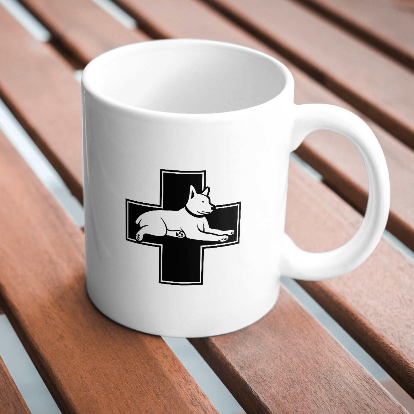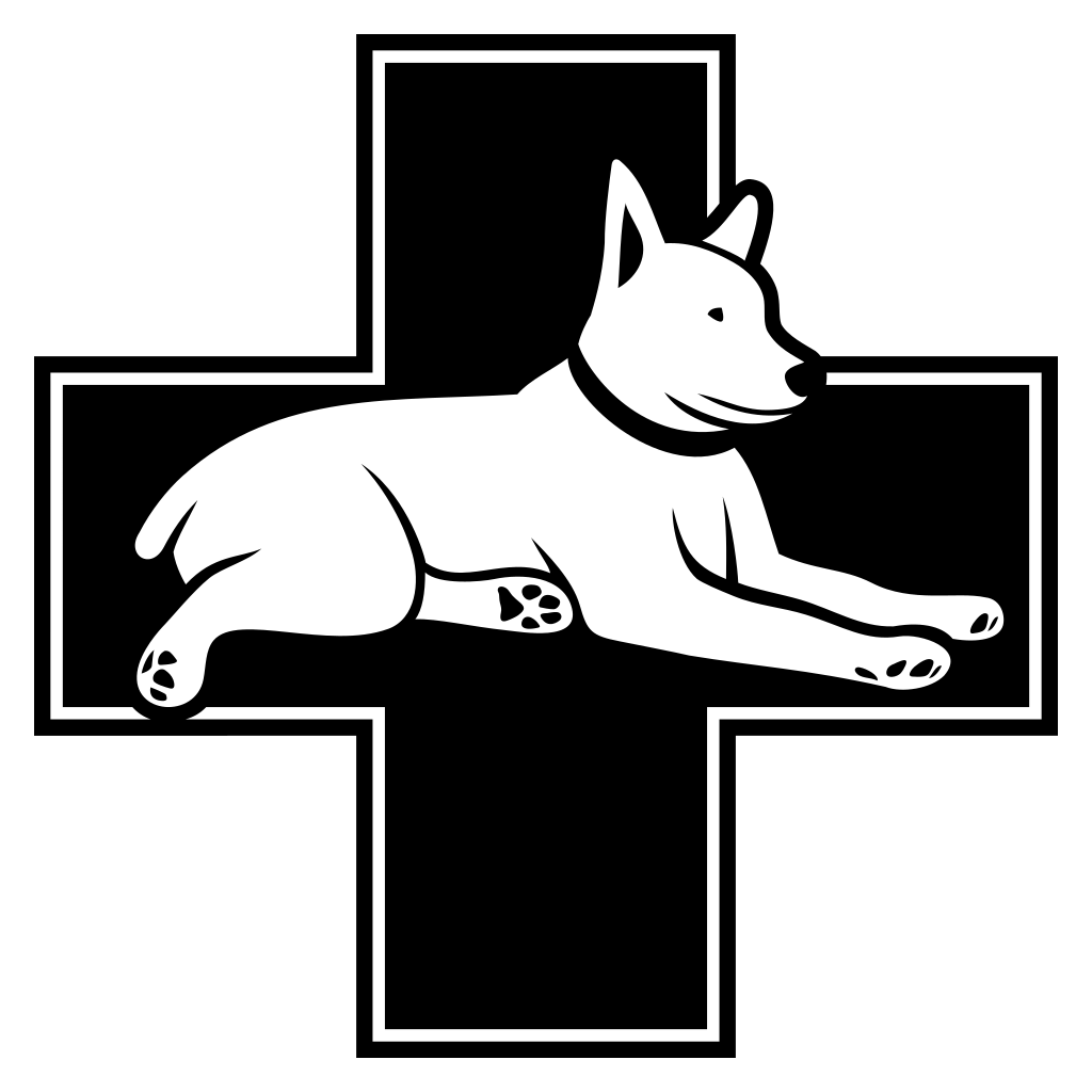 This vector design showcases a playful pet first aid label featuring a charming illustration of a dog and a medical cross. Perfect for safe pet care branding.