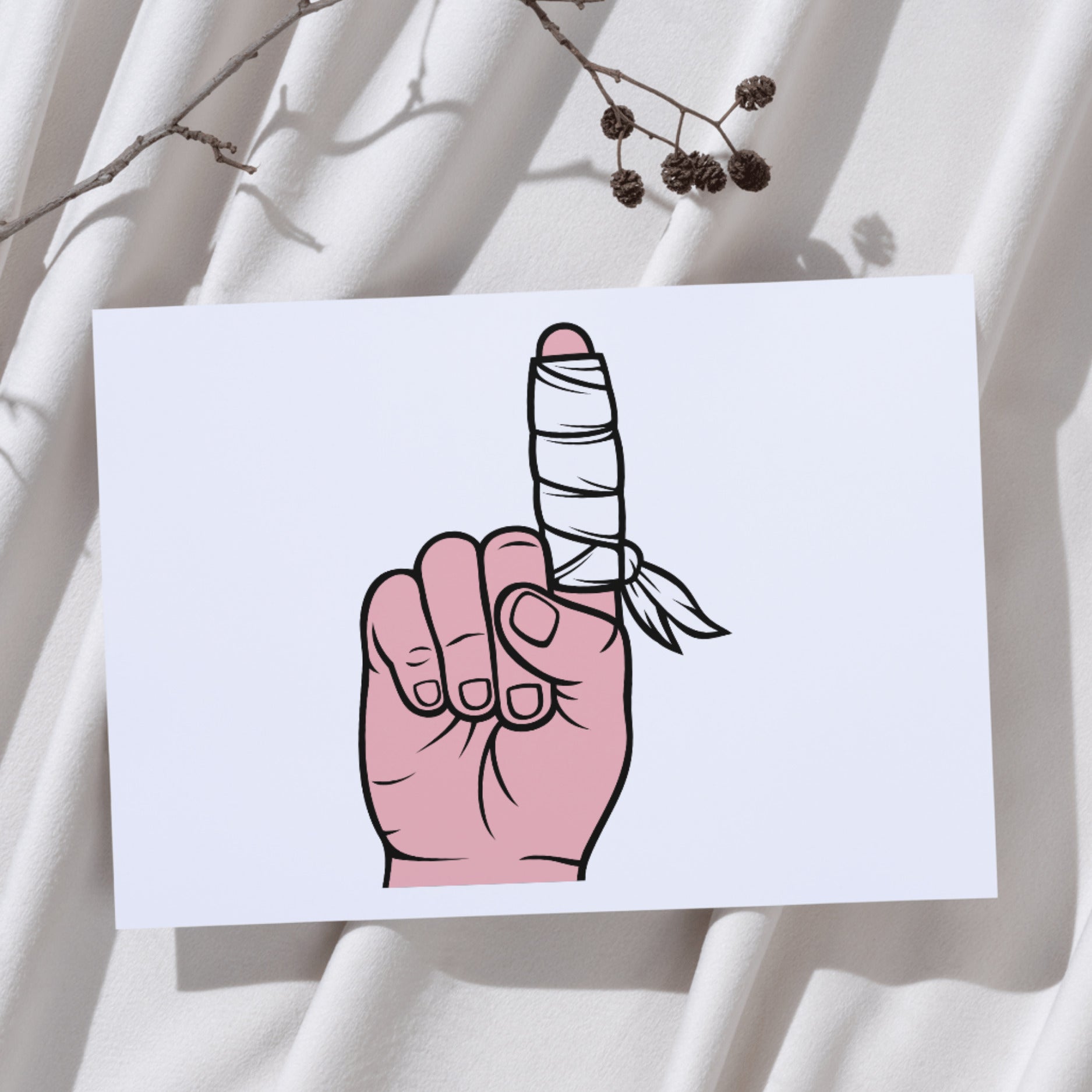 A hand with a bandaged finger points upward, showcasing a unique blend of artistry and practicality. Perfect for crafting projects or design inspiration in various creative fields.