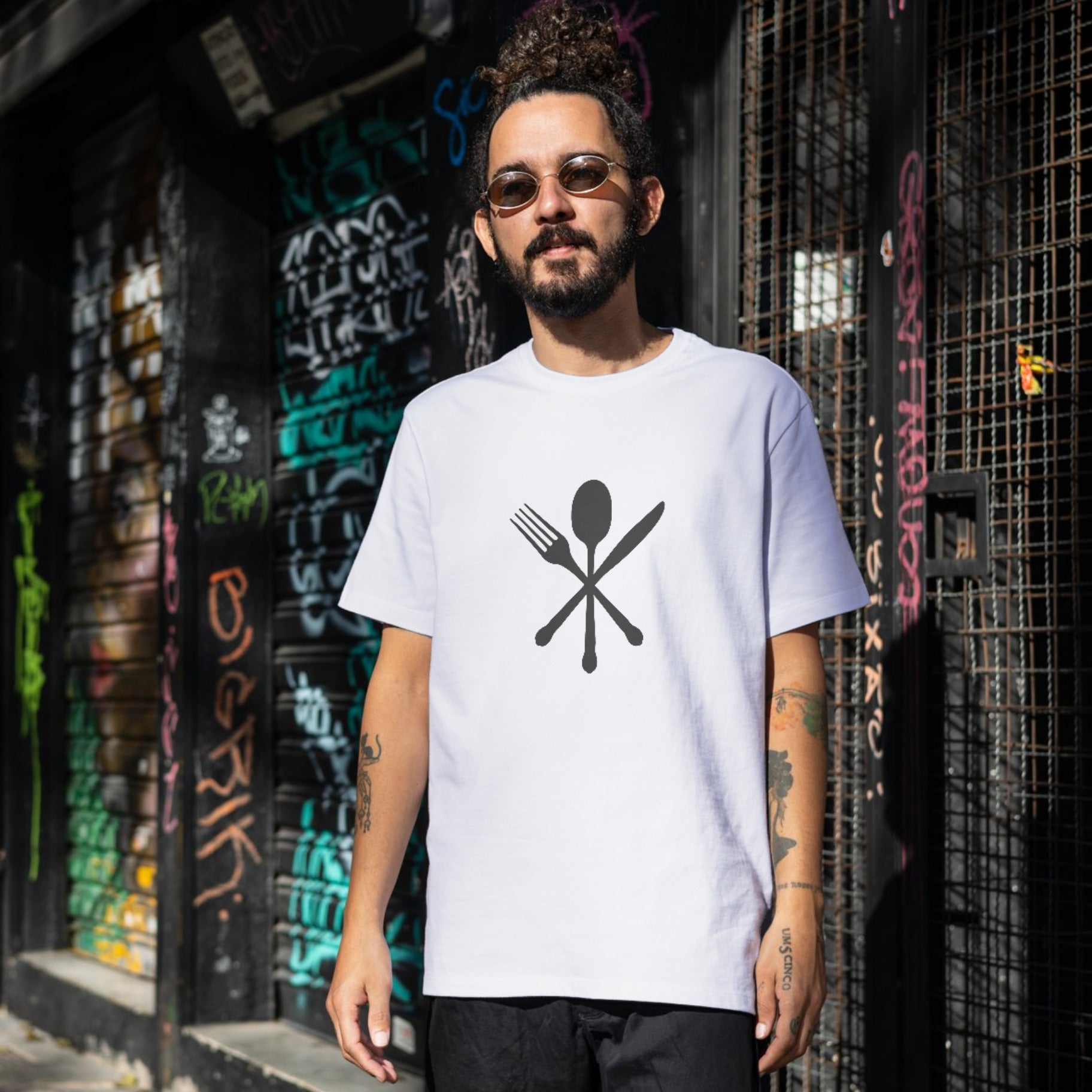 Stylish vector graphic showcasing a fork, spoon, and knife arranged in a dynamic cross pattern, ideal for cutting machines, culinary projects, and artistic designs to enhance creativity.