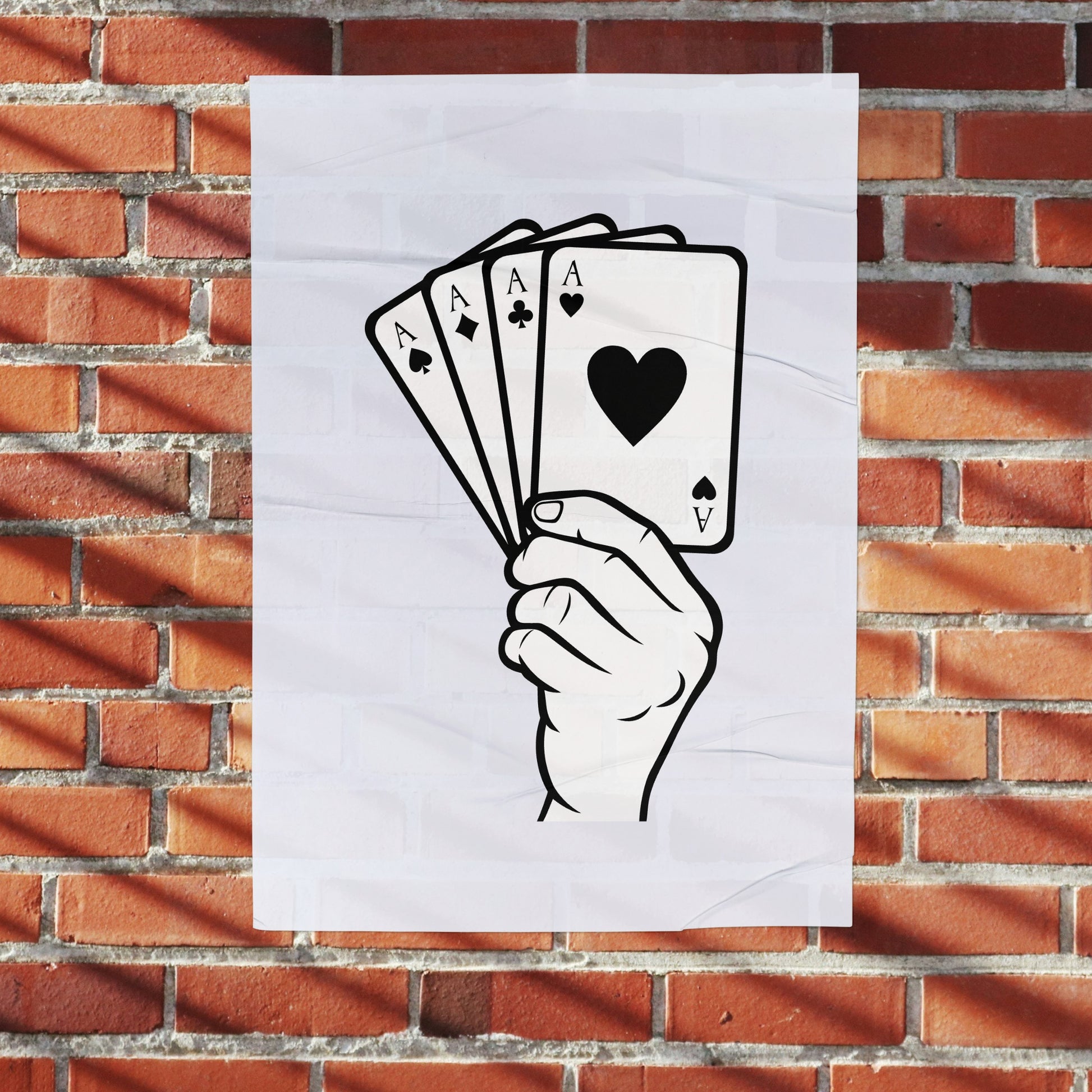 A hand grips four playing cards, showcasing their vibrant designs and suits. This dynamic composition highlights the excitement and strategic nature of card games in various casual settings.