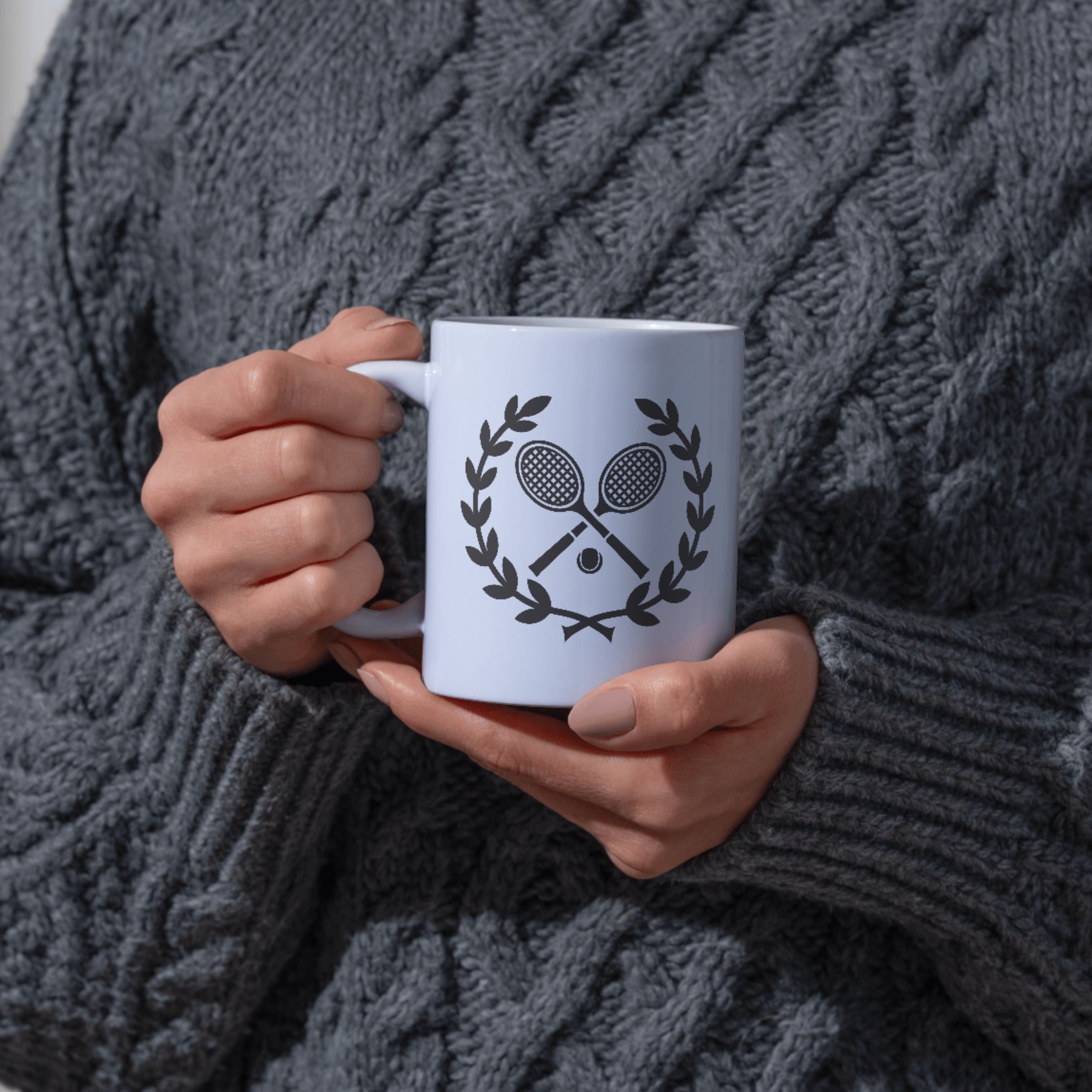 This design features a beautifully crafted wreath of laurel leaves encircling two crossed tennis racquets and a tennis ball, perfect for sports enthusiasts and crafts.