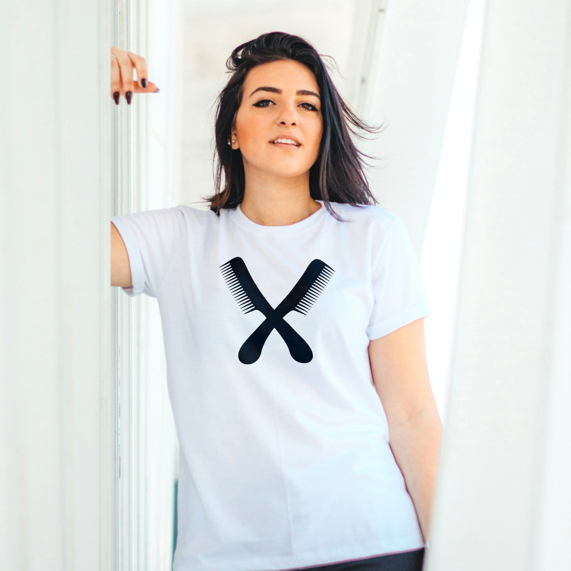 Two stylish combs are artistically crossed, creating a unique design perfect for cutting machines. This vector artwork is ideal for craft projects or salon branding purposes.