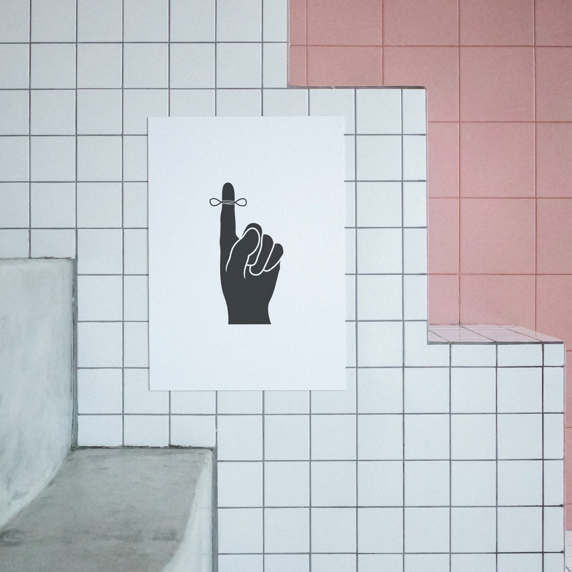 Stylish and minimalist representation of a hand raising a finger with a delicate infinity loop. This design evokes a sense of connection and continuity, perfect for various creative projects.