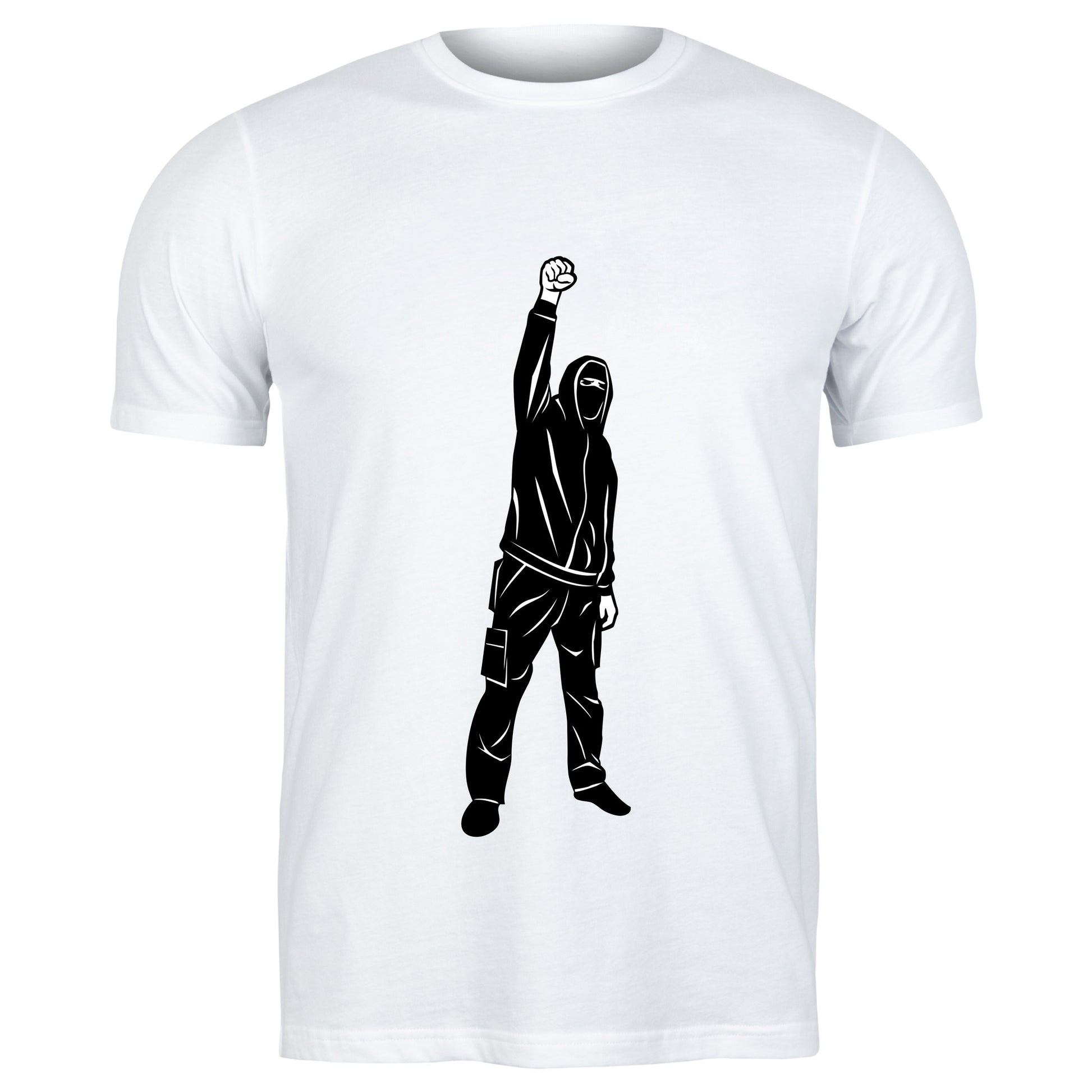 A determined individual stands tall, clad in a hooded outfit, raising a fist in a powerful gesture of unity and activism. This artwork symbolizes strength and resilience in the fight for justice.