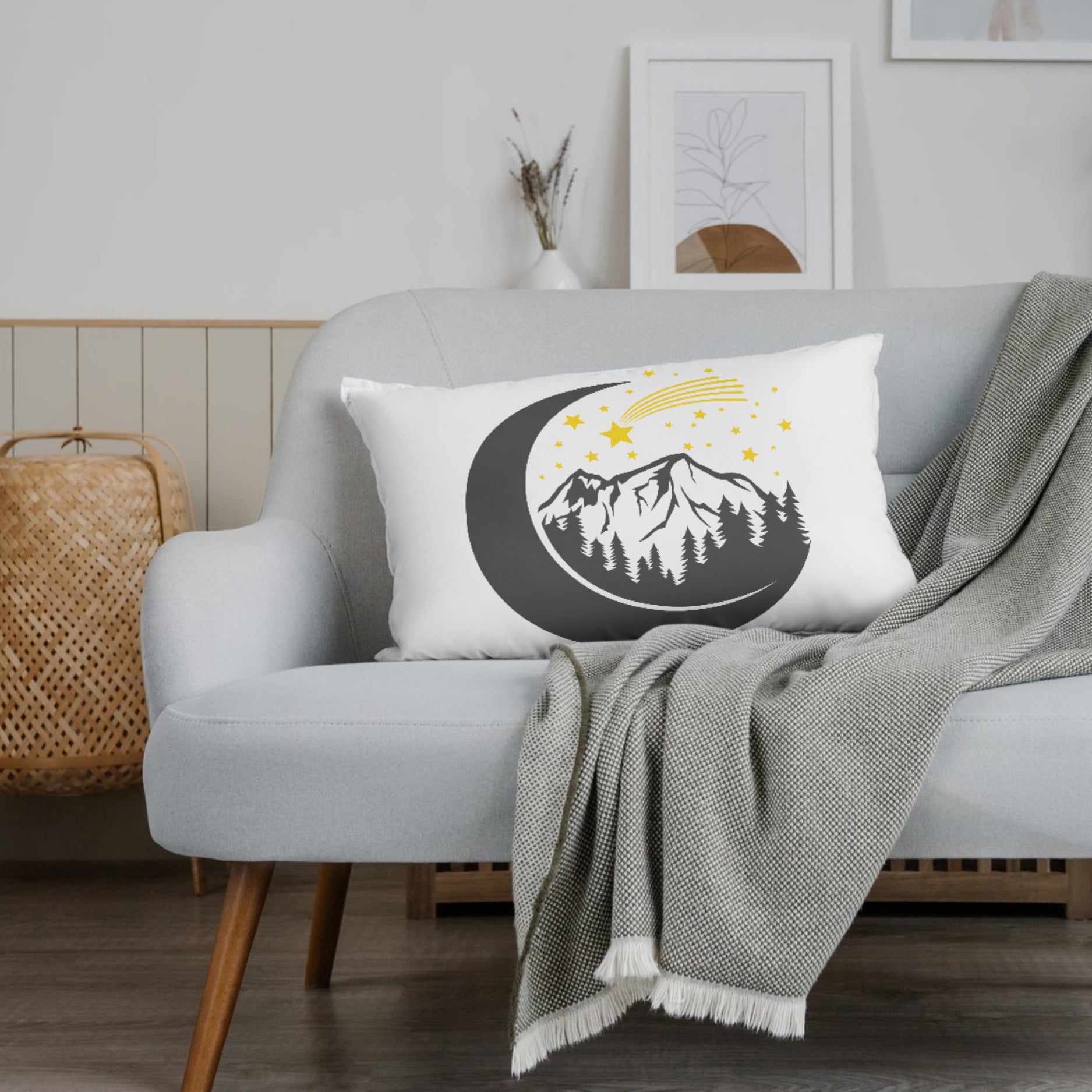 A breathtaking depiction of a mountain range nestled within a crescent moon, surrounded by a serene forest and sparkling shooting stars illuminating the night sky.