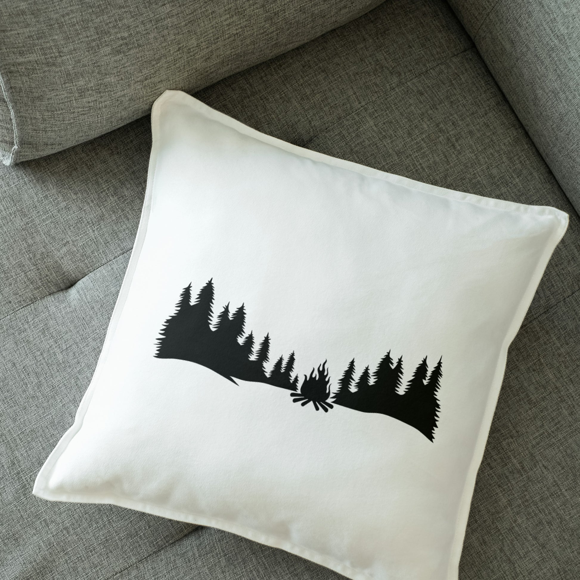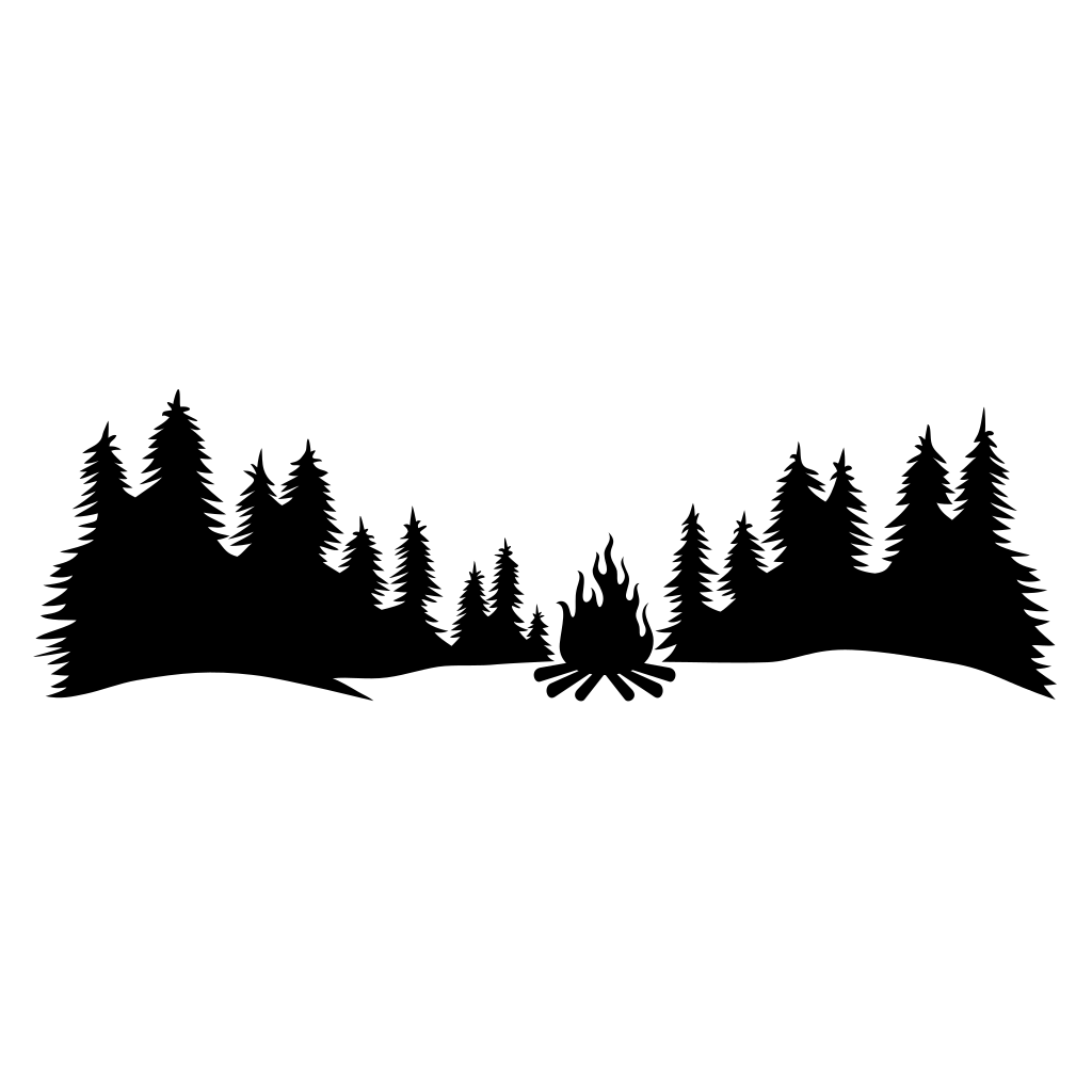 Experience the serenity of camping in a lush forest surrounded by tall pine trees. A cozy campfire flickers warmly, inviting relaxation and adventure at dusk.