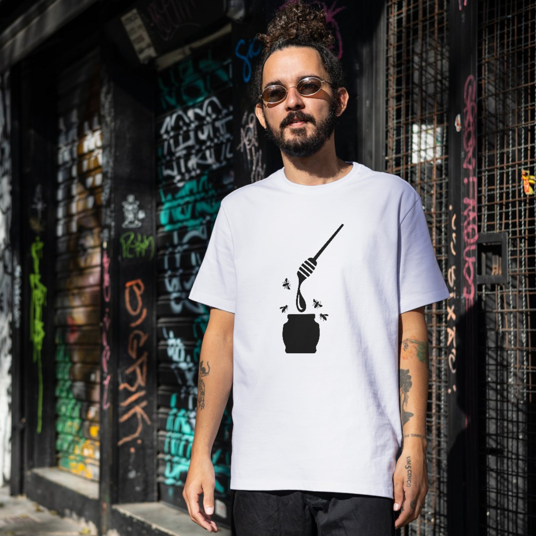 Honey gracefully drips from a wooden dipper into a pot while whimsical bees flutter around, capturing the essence of nature's sweet creation in a cozy, artistic setting.