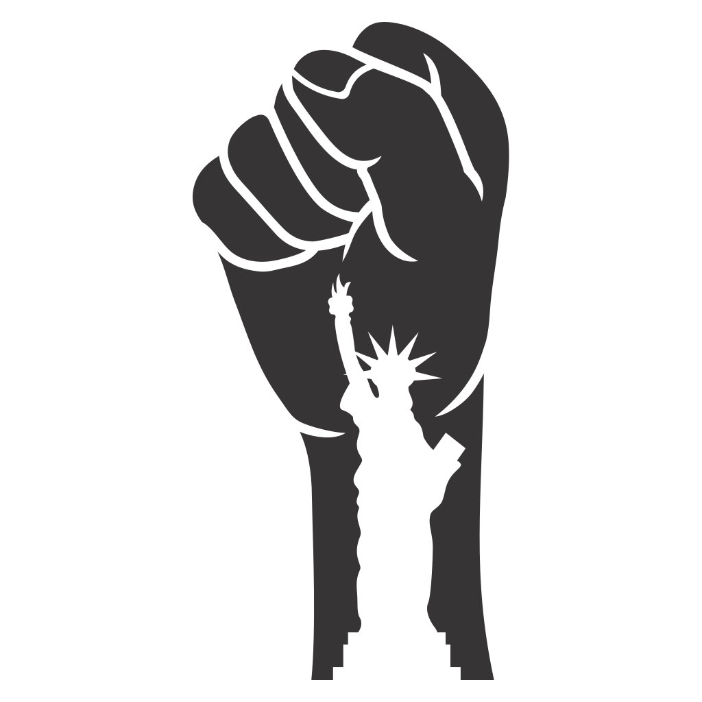A powerful depiction of a raised fist symbolizing revolution and solidarity, featuring the Statue of Liberty emerging from its grip. The artwork embodies hope and resilience against oppression.