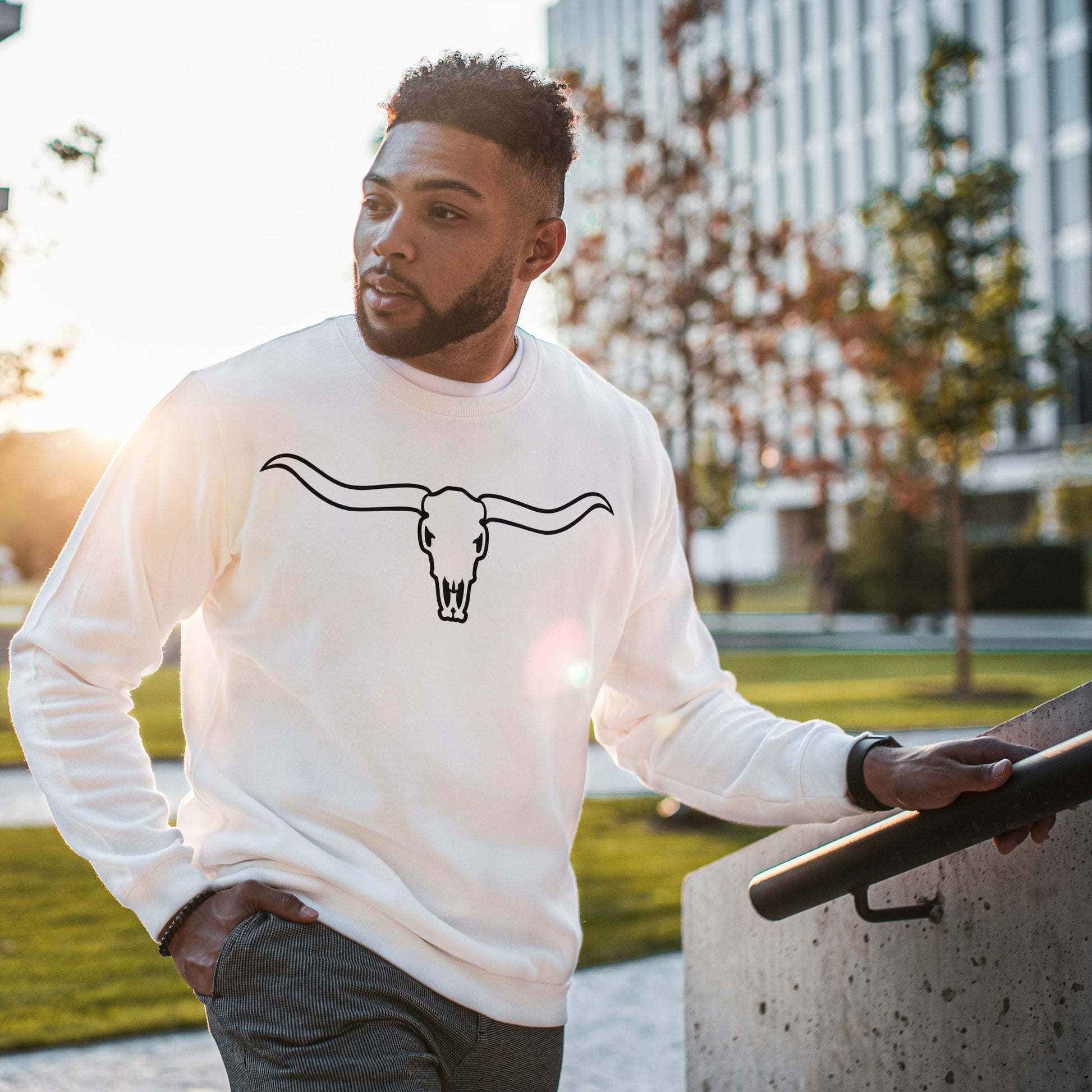 This striking longhorn skull design features intricate black and white detailing, perfect for various crafting activities like cutting, printing, and unique home decor.