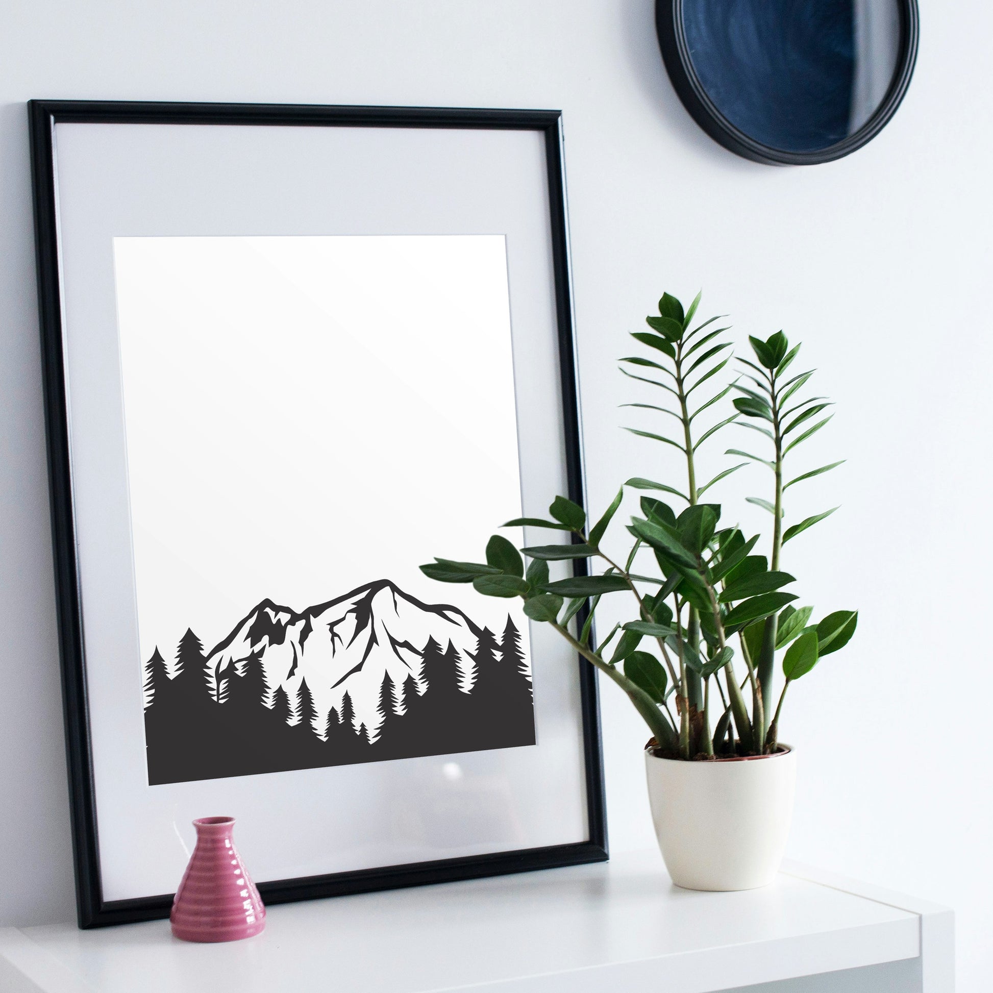 Capture the beauty of nature with this stunning vector design of a mountain landscape. Perfect for cutting machines, it features towering peaks and lush trees, inspiring creativity.