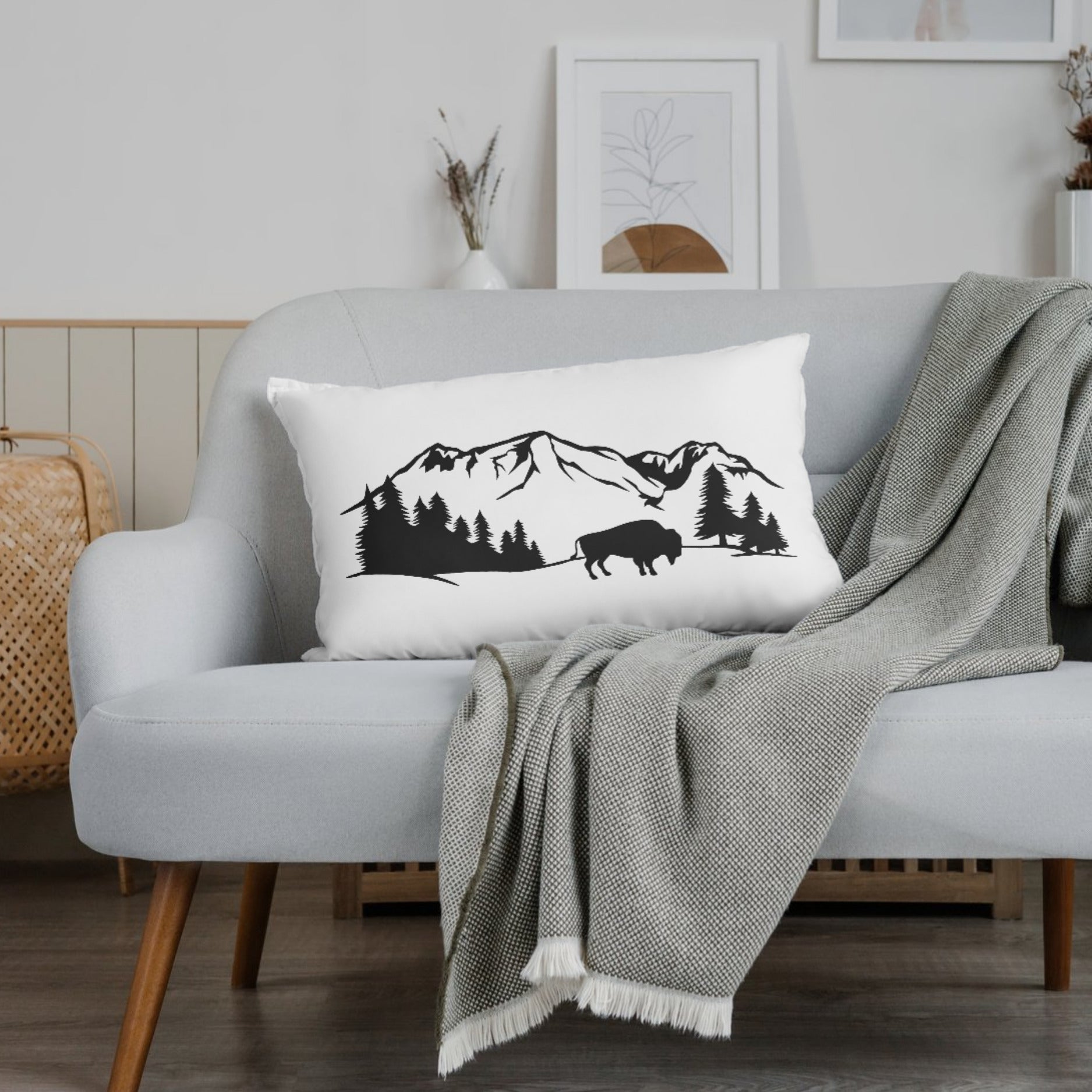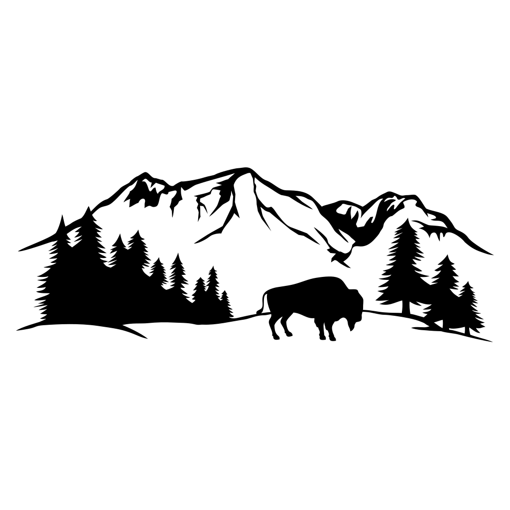 A stunning vector design of an American bison roaming before majestic mountains. Pines frame the scene, capturing the essence of nature and wildlife. Perfect for creative projects.