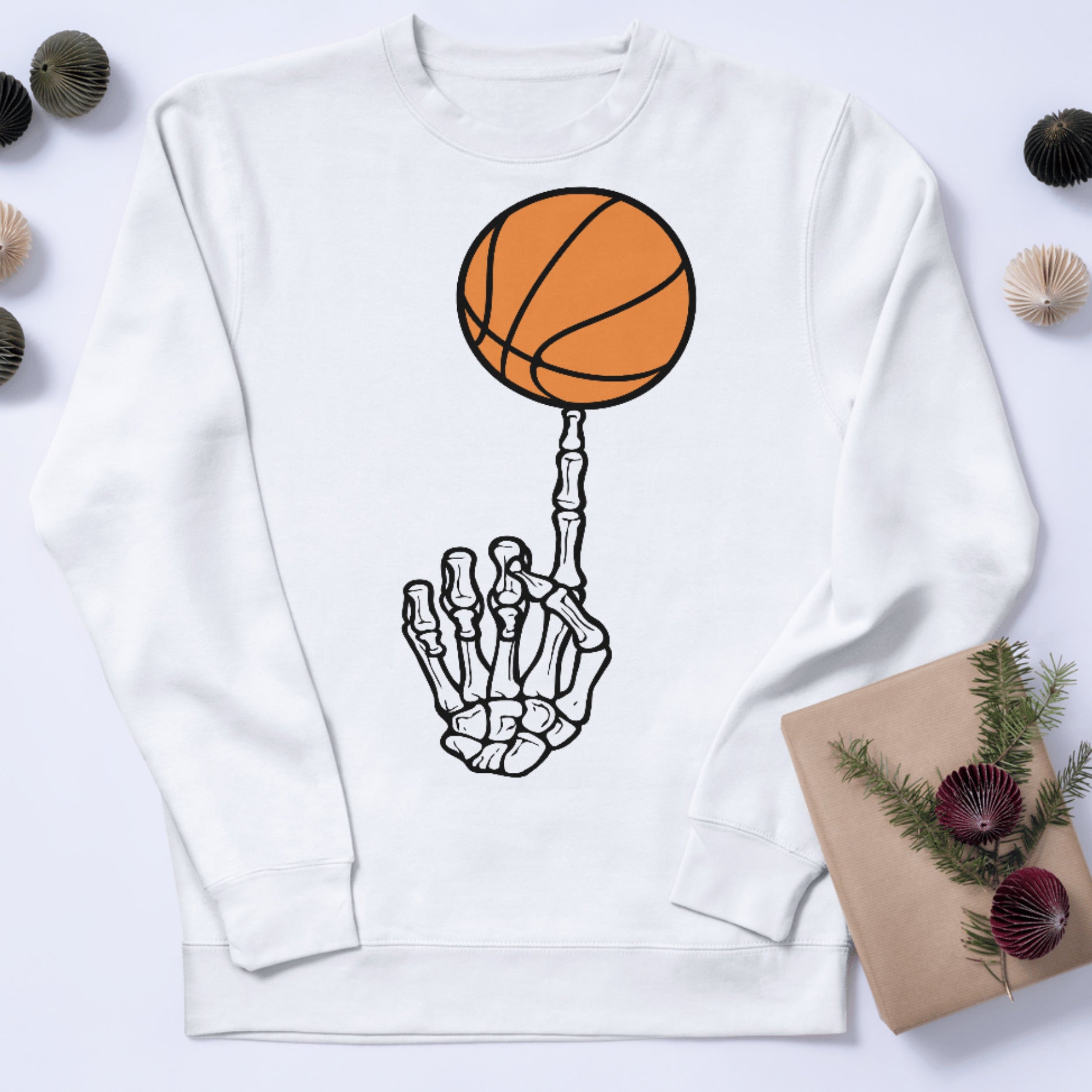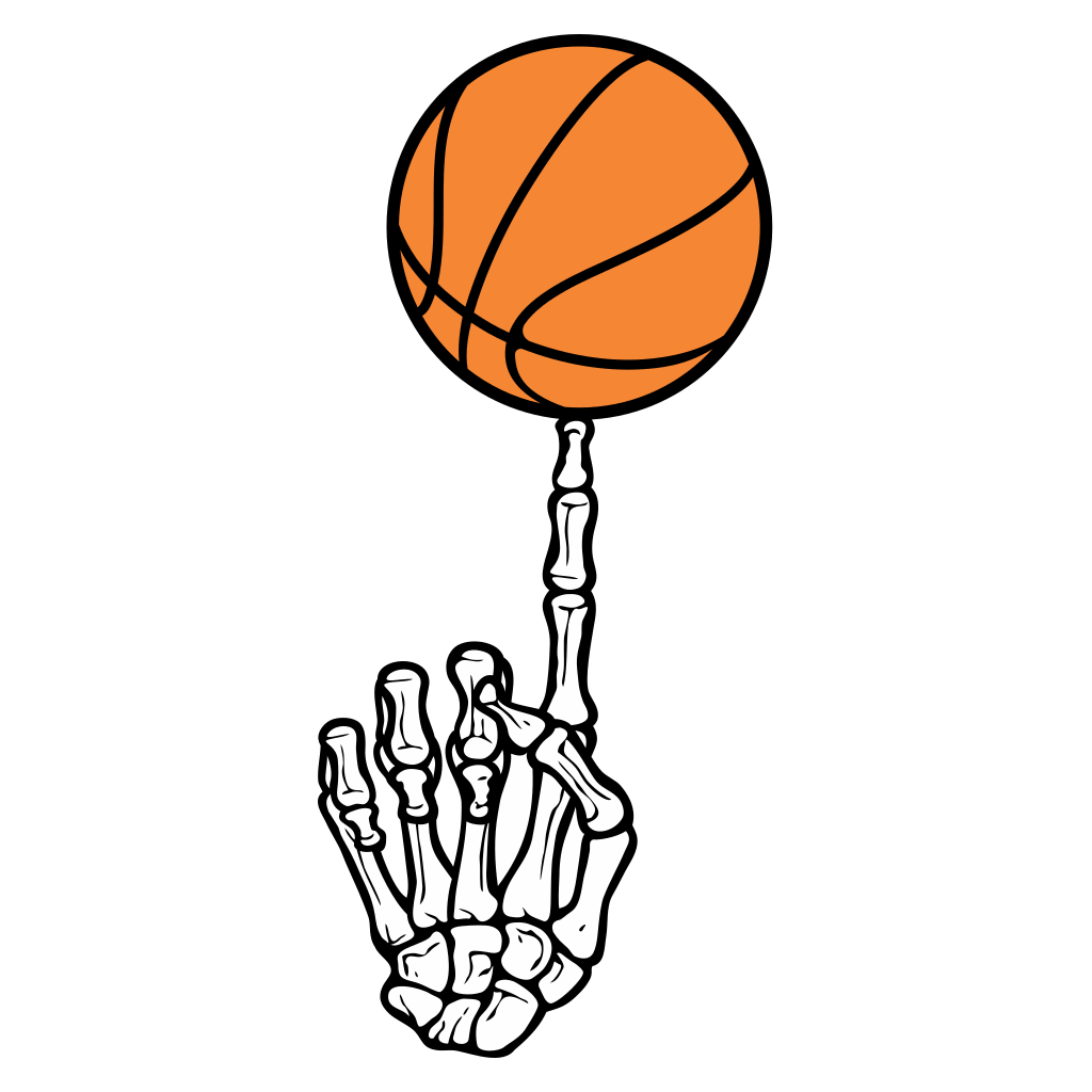 A unique design featuring a skeleton hand skillfully spinning a basketball on its fingertip. Perfect for crafting projects, this artistic vector adds a fun element to your designs.