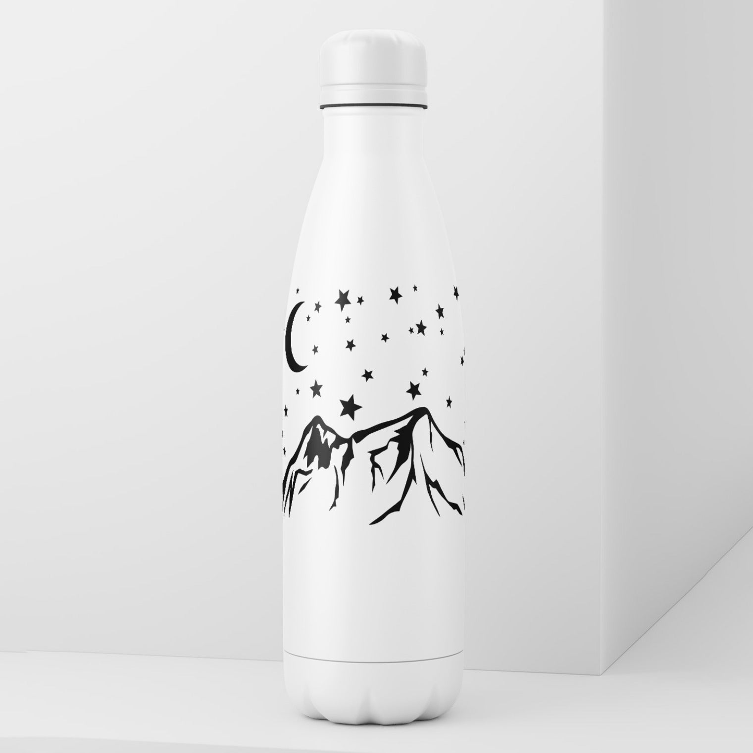 Mountains rise majestically against a backdrop of twinkling stars and a gentle crescent moon, perfect for creating unique crafts with cutting machines, evoking adventure and peace.