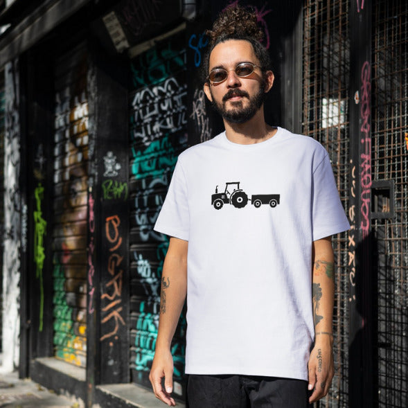 A detailed vector illustration showcasing a robust tractor towing a simple wagon. Ideal for crafting projects, adding rustic charm to farm-themed designs, or enhancing DIY creations.